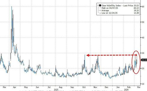 All of which sparked the biggest weekly jump in VIX since Liberation Day (though VIX remains lower than its recent peak in Oct 2025)...