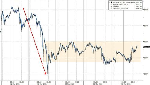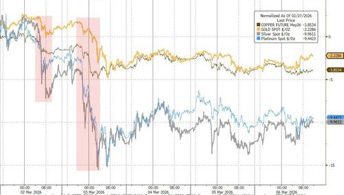 The dollar's strength was enough to offset any safe-haven flows into precious metals which had a very tough week (source of funds?) with silver and platinum hit hardest. But we do note that - like the dollar - most of the action was Monday and Tuesday with PMs treading water 'off the lows' since...