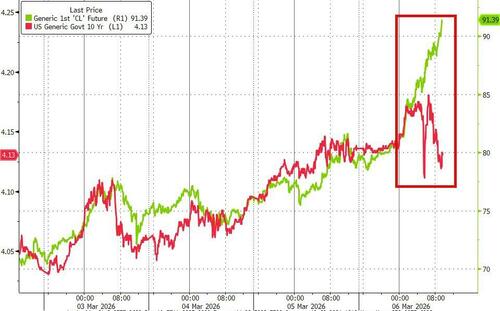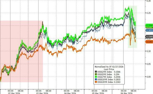 Treasuries ended the week with a modest reprieve as dismal jobs data trumped a further surge in oil prices (is this the start of a 'global recession' being priced or just a US-centric kneejerk?)...