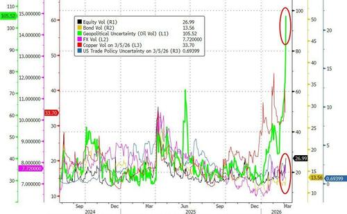 While geopolitical uncertainty (proxied by oil vol) soared, we also saw cross-asset implieds jumping notably with bond vols back to 3 month highs, and FX vol elevated...