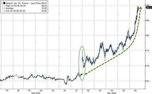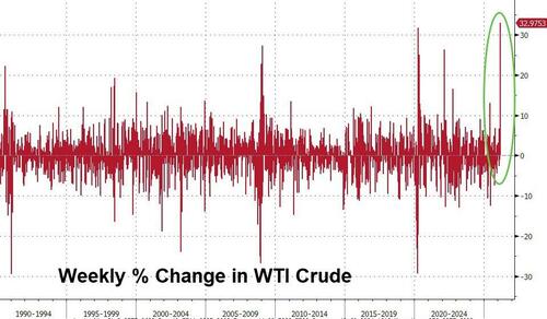 First things first... the attack on Iran triggered the biggest weekly jump in WTI crude since... ever (going back to 1990)...