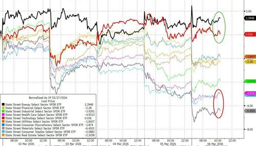 Mixed bag at the sector level with Energy outperforming (as one would expect) followed by Tech (safe haven flows) and Materials the big laggard (global recession/margins). Defensives like Healthcare and Staples were ugly though (higher yields)...