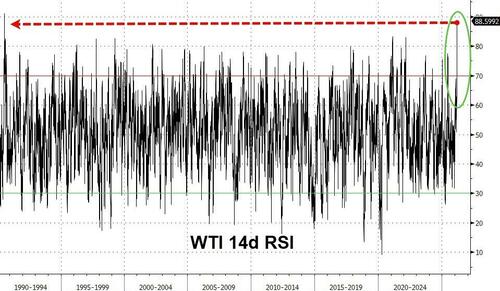 As you can see, the reading is barely negative now, with the jump in crude prices just starting to weigh on risk assets. The headline numbers don’t tell the full story either. WTI crude above $85 a barrel means that prices have already surged by more than 50% since their December lows... to their most overbought since 1990...