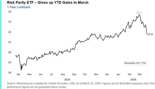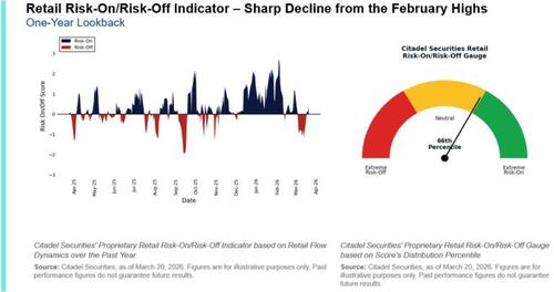 The Citadel Securities Retail RORO (Risk-On/Risk-Off) has declined sharply from February highs.