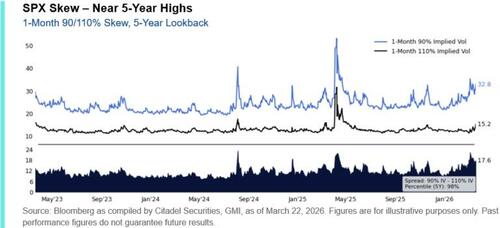 S&P 500 skew reached the 98th percentile over the past five years, driven by elevated institutional hedging demand.