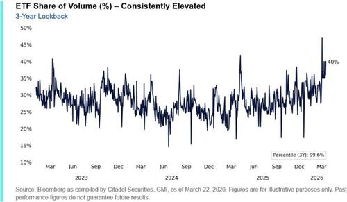 ETFs have accounted for ~35% of trading volume over the past three weeks, peaking at 47%, and setting a record streak above 35%.
