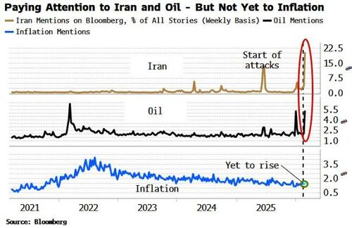 The percentage of stories on Bloomberg mentioning Iran and Oil has expectedly exploded since the US-Israeli strikes began. But there has been no uptick to speak of in mentions of inflation.