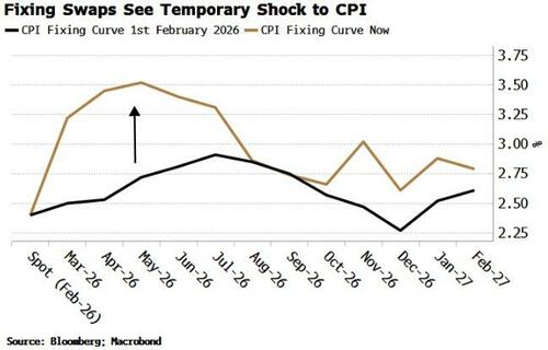 CPI is currently expected to rise sharply to about 3.5% in a few months, before trending lower to about 2.8% in a year’s time, i.e. only about 40 basis points above spot.