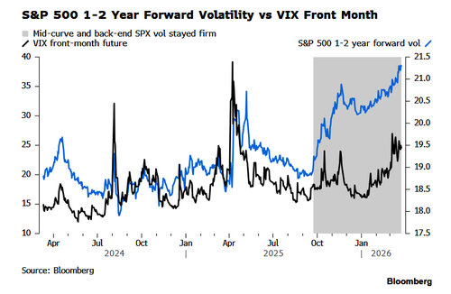 “It may not take a sharp shock to push the volatility regime higher,” said David Elms, head of diversified alternatives at Janus Henderson Group Plc. “Six months of $100 oil is more of a ‘boiling frog’ dynamic — slowly eroding the data backdrop and ultimately forcing analysts to cut growth forecasts and bring down year-end targets.”