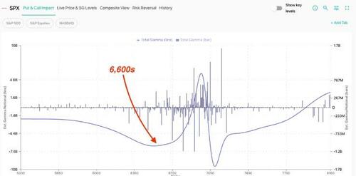Negative gamma still troughs in the 6,600s, and a move to that level still seems calibrated to meet VIX 30.