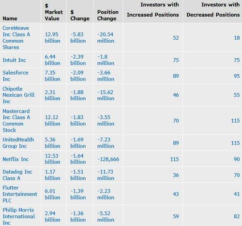 Holdings of CoreWeave dropped $5.83 billion, the biggest decrease by market value during a tough stretch for the company. In addition to pressure on AI stocks and weak guidance, Core Scientific shareholders rejected the company’s takeover bid, dealing a blow to its expansion efforts. Magnetar sold 13.83 million shares in CoreWeave shares, the biggest reduction by the investor group; Coatue sold 11.07 million shares.
