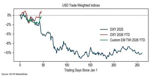 As Schmitten notes, starting off, the main flow we’ve seen this week was USD vs everything – a clear break to the YTD trend, which looked more like a continuation of last year.