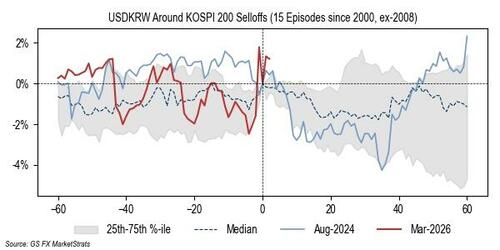 What does this mean for USDKRW going forward? Historically speaking, KOSPI drawdowns have actually led to USDKRW trading lower in the subsequent days. Below we take the 15 largest 5-day % drops, with non-overlapping windows of 60 days...