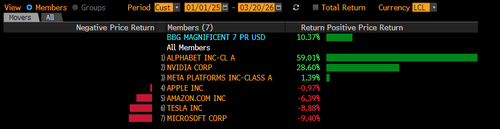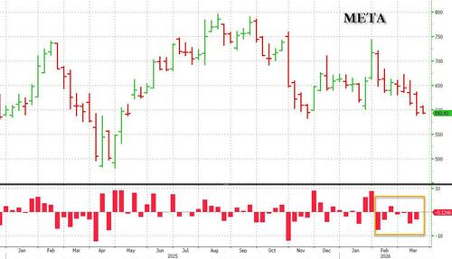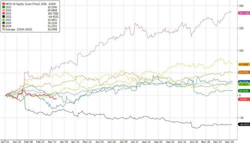 Stalling out: Meta is up just 1% over the last 15-months (chart below = Mag 7 performance since the start of 2025) -- lagging the broader Mag 7 group (up 10% over this stretch) …