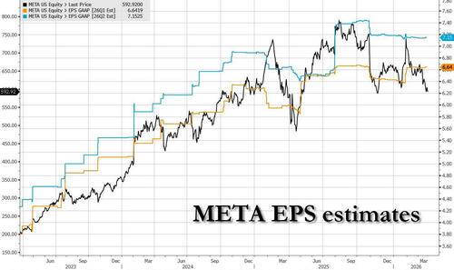 META; the stock has stalled out (white line) just as GAAP EPS revisions have stalled out (orange line) – consensus EPS ests have stalled out in the ~$29-30 range over the last ~18-months. To Goldman TMT specialist Peter Callahan, this is a very important chart given the (understandable) bull argument that Meta is ‘cheap’ on GAAP EPS – feels like the stock needs to see (+) GAAP EPS Revisions for that argument to gain traction.