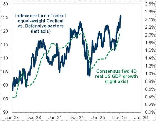 Cyclical and defensive equities imply to us a ~2.5% real growth rate, which is solid, but improving the implied growth forecast towards 3% would imply a roughly 8% upside to S&P over the next 3 months.