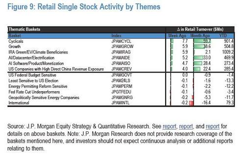 - This week, retail investors continued to buy Cyclicals, Growth, AI datacenters and electrification (JPAMAIDE), and AI Software/Product/Monetization (JPAMAISO), along with IRA Green/EV/Climate Beneficiaries. Conversely, they continued to sell International companies (Figure 9).