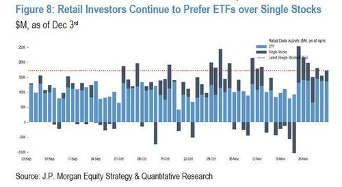 To analyze the performance of retail investors, JPMorgan's Retail Radar team looked their P&L across ETFs and Single Stocks. In ETFs - which represented 75% of retail’s invested dollars this year (see Figure 6 below) - retail investors outperformed both SPY and QQQ, thanks to their larger Tech bias and successful risk taking in precious metals during the September and October gold rush.