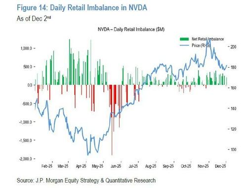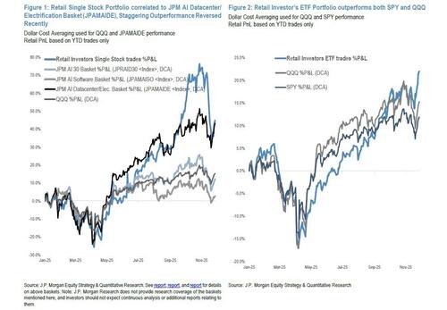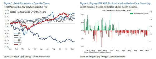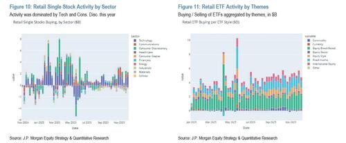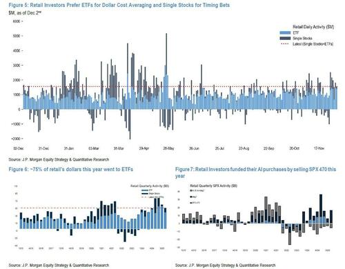 While 2025 was a very tough year for institutional investors in general, and hedge funds in particular, with sentiment turning apocalyptic - and extremely short - just after Liberation Day, with the subsequent rally resulting in significant MTM losses and forced covering, it was a much better year for retail investors who followed a much simpler script: they built substantial positions in AI/Tech companies, did not panic sell during drawdowns, and instead aggressively bought the dip during 3 episodes of weakness between Jan and Apr. Then, from May onward, they scaled back their stock purchases and shifted their focus to trading ETFs, chasing interesting trends such as GLD, which in turn proved to be one of the best investment of the year.