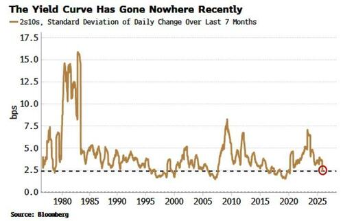 This is not a normal cutting cycle. Since the aftermath of President Trump’s “Liberation Day” tariff announcements, the 2s10s curve has been almost still compared to history. The volatility of its daily move has been lower only a handful of times over the past 50 years.