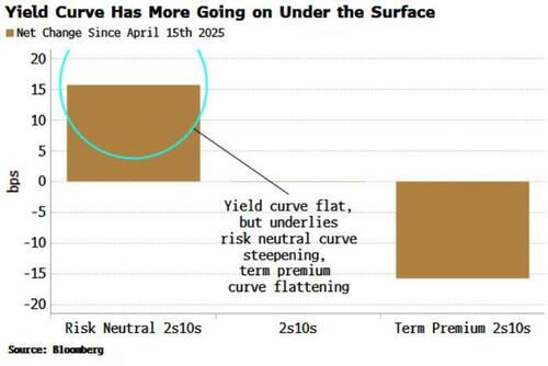 When we disaggregate the move in the yield curve, however, we find something more unusual. The net move in the 2s10s curve since April 15 (when the curve settled down after the initial tariff-driven volatility) has been near zero. However, it underlies a rise in the 2s10s term premium curve versus the 2s10s risk-neutral curve (using ACM term premium; as a reminder, Treasury Yield = Risk-Neutral Rate + Term Premium).