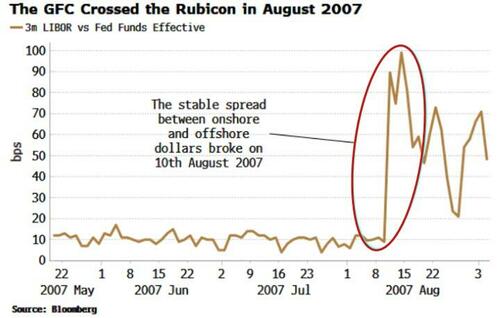 As we can see from the chart above, those occurrences were not random. The last was on August 9, 2007, literally the day before the first clear signs that something was seriously amiss in the money markets, as the implicit parity between onshore and offshore dollars broke.