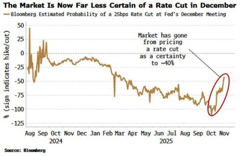 Market expectations for the Fed cutting at its December meeting have fallen from 100% to under 40% despite no new significant economic data nor comments from Powell. This is not necessarily a bad thing – introducing some uncertainty back into markets will quell some of their more exuberant tendencies.