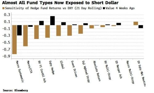 Hedge fund styles almost across the board look to be positioned short the US currency, based on the sensitivity of their returns to the DXY index.