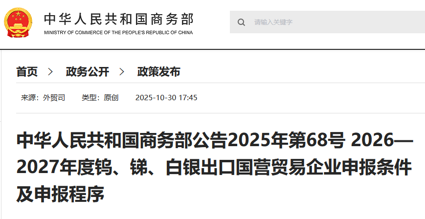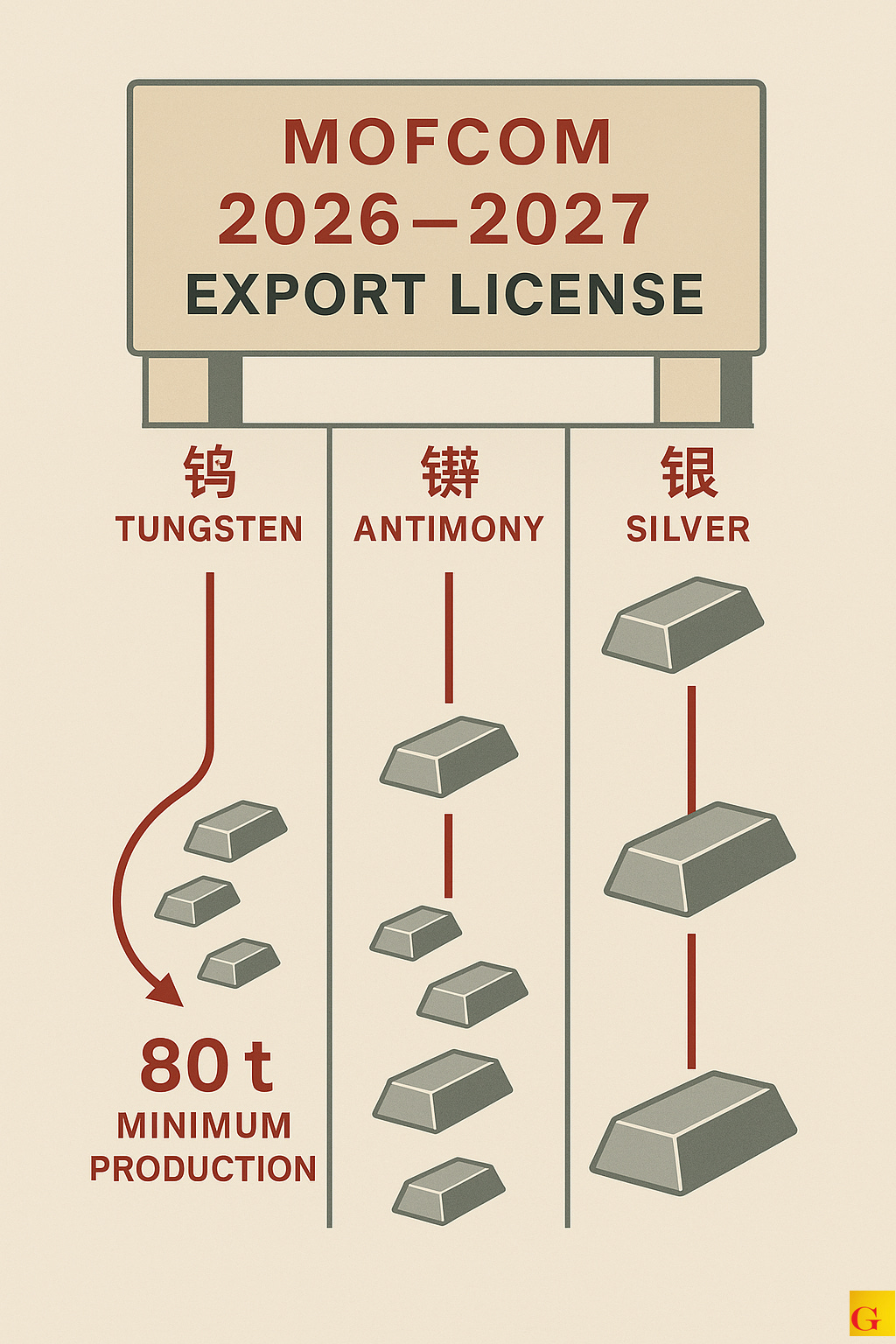 The Ministry of Commerce of the People’s Republic of China (MOFCOM) has issued Announcement 2025-No. 68 (mofcom.gov.cn), imposing stringent conditions on the export of three critical minor metals — tungsten, antimony and silver — for the period 2026-2027. The move reflects China’s intensifying resource-security agenda and tighter export controls over strategic materials.