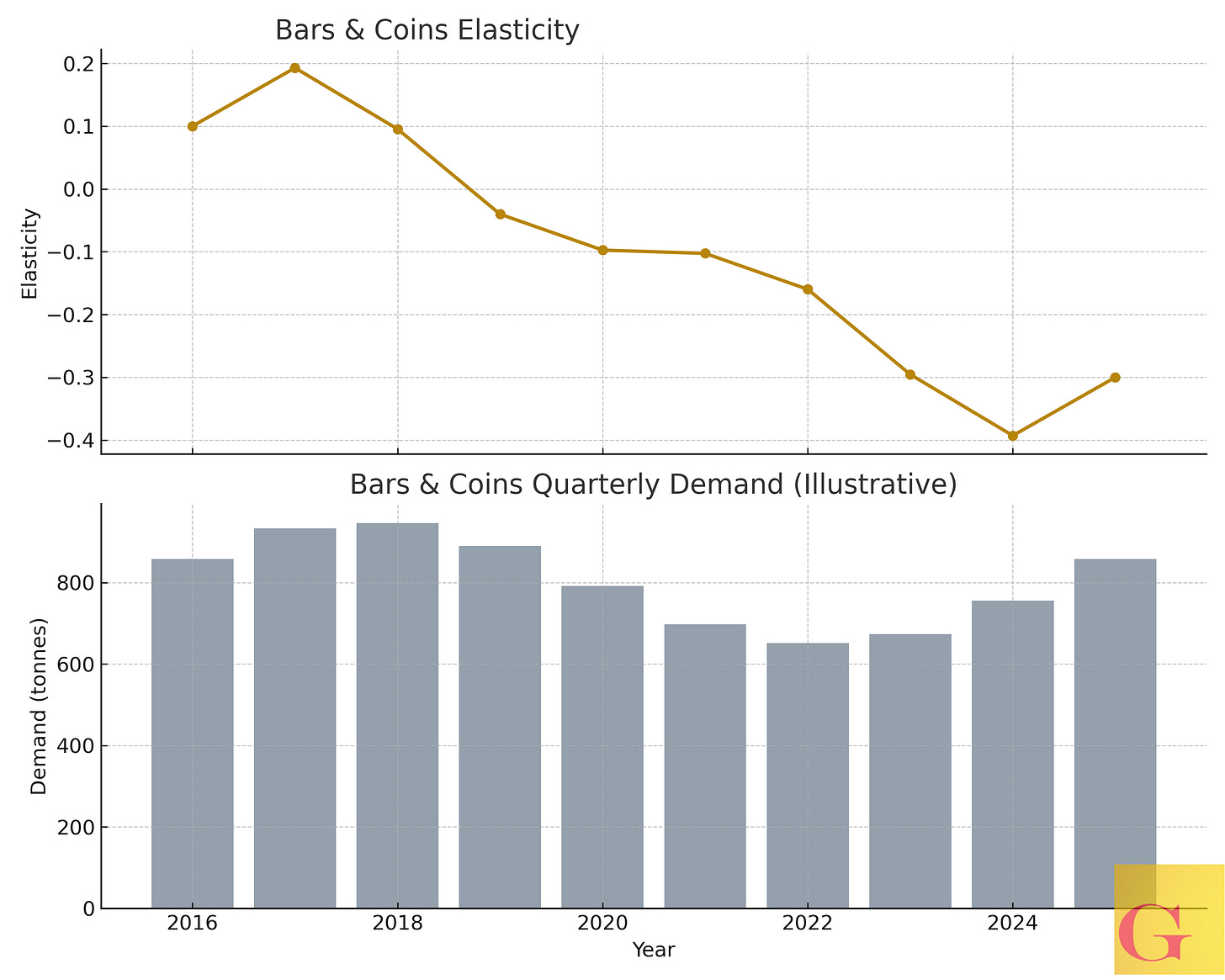 Bars and coins display behavior characteristic of investment-driven demand. As of late 2025, the elasticity estimate sits near 0.4, meaning investors increase purchases as prices rise. SocGen attributes this to momentum-driven psychology, with buyers attempting to maintain exposure during rally conditions and avoid missing further upside.