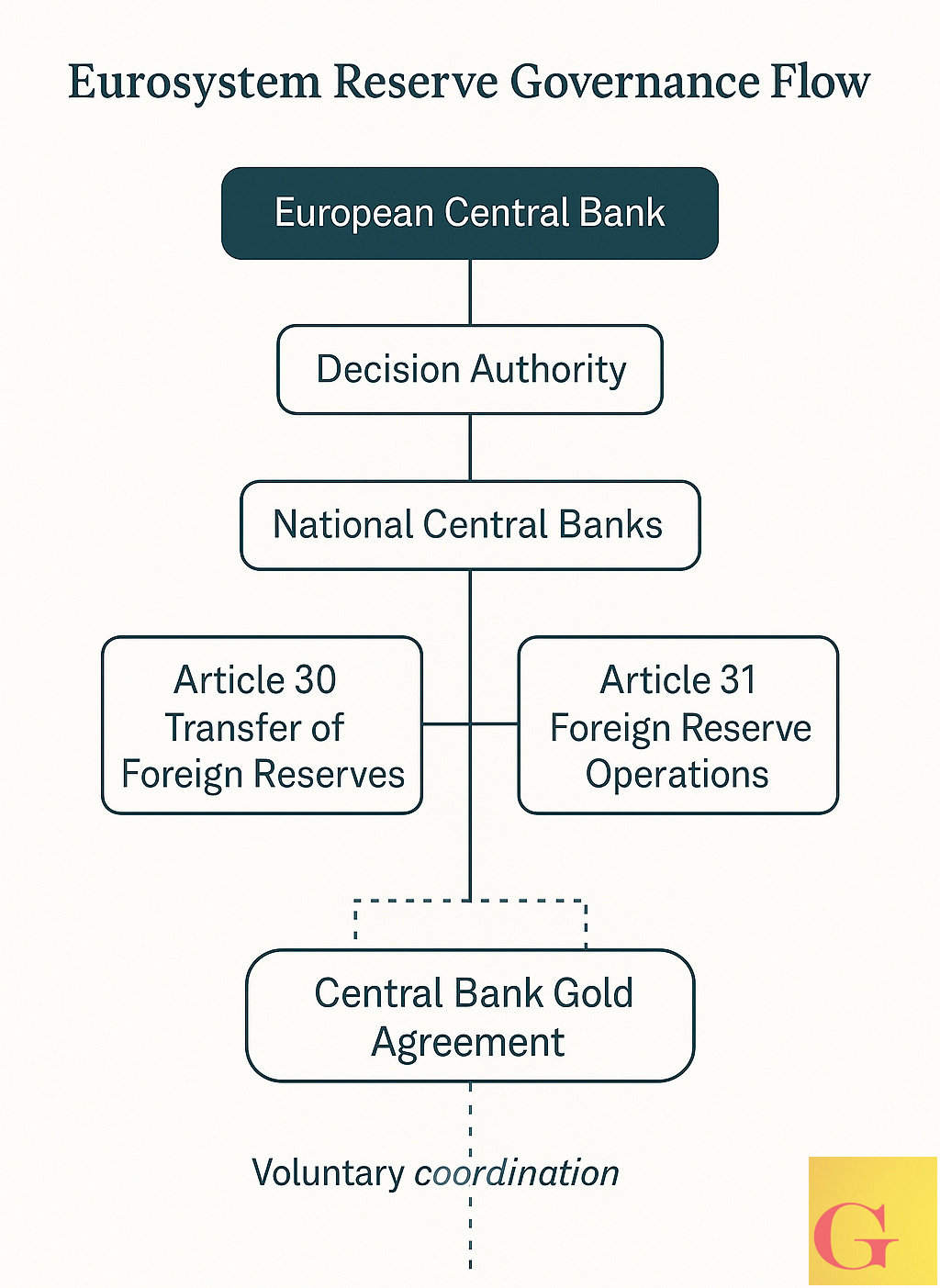 When Italy entered the euro area, it surrendered a portion of its foreign reserves to the ECB under Article 30 of the European System of Central Banks statute. Remaining reserves stayed on national central bank balance sheets, but Article 31 then subjected all significant foreign-exchange and gold operations to ECB oversight in order to preserve consistency with euro-area monetary and exchange-rate policy. National central banks retained custody of gold, but not unilateral discretion in its disposition. Sales, leasing, derivatives activity, and reserve conversion operations became subject to coordination and approval thresholds set at the Eurosystem level.