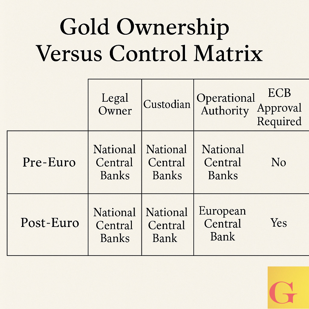 The outcome was a de facto centralized reserve governance structure. National central banks continued to warehouse gold within their vaults and maintain formal booking ownership, yet operational policy became subordinated to supranational constraint. The traditional model of sovereign reserve autonomy gave way to collective management under ECB governance.