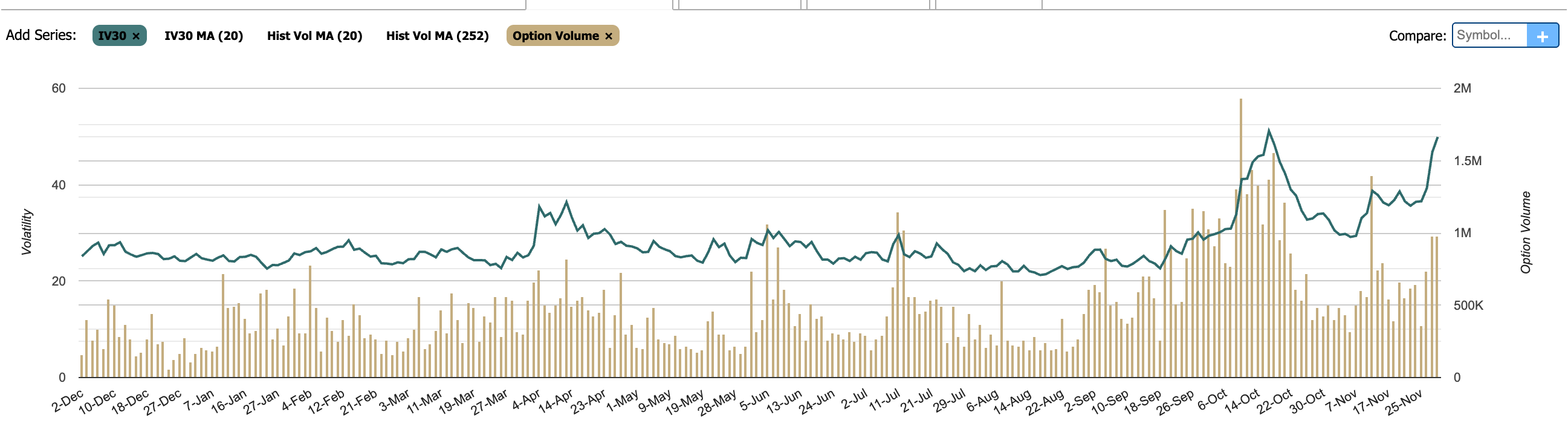 Next, you can see (thanks to the fantastic options trading site Market Chameleon) the volatility has spiked again, just like last month.