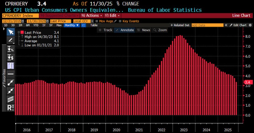 Another standing ovation for the “inflation is dead” fan club: Owners’ Equivalent Rent—the CPI’s resident zombie—shambled in at +3.4% YoY in November, down from September’s +3.8% and triumphantly posting its coldest reading since November 2021… proof that even the undead can slow down without actually dying.