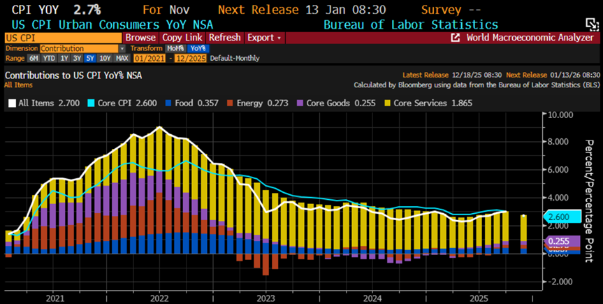 The eleventh CPI print of this so-called Jubilee Year—really just the tenth, thanks to October’s “Shutdown Circus” disappearing act—finally took the stage at a modest +2.7% YoY, cooler than September’s +3.0%, below the +3.1% forecast, and the chilliest reading since July. Energy, however, refused to follow the script: despite victory laps about “cheap gas,” prices quietly re-accelerated year-on-year from +0.18% to +0.27%. Meanwhile, core goods and core services behaved themselves, clocking their lowest YoY increases since last July and September 2021—proof that inflation can cool, but it never quite exits the room.
