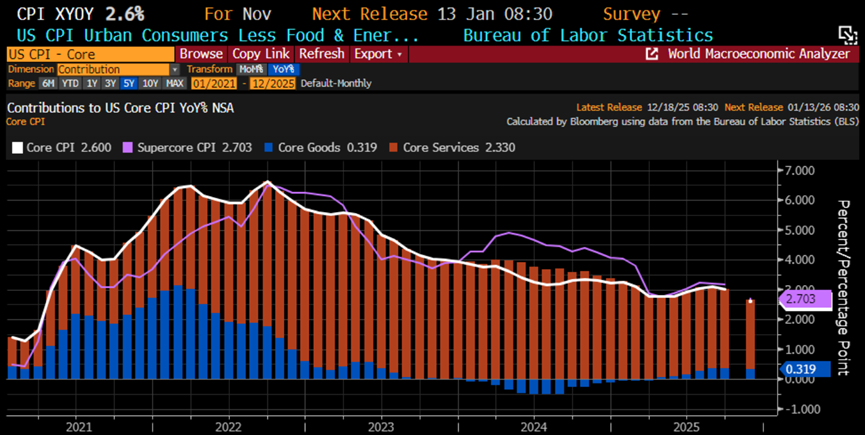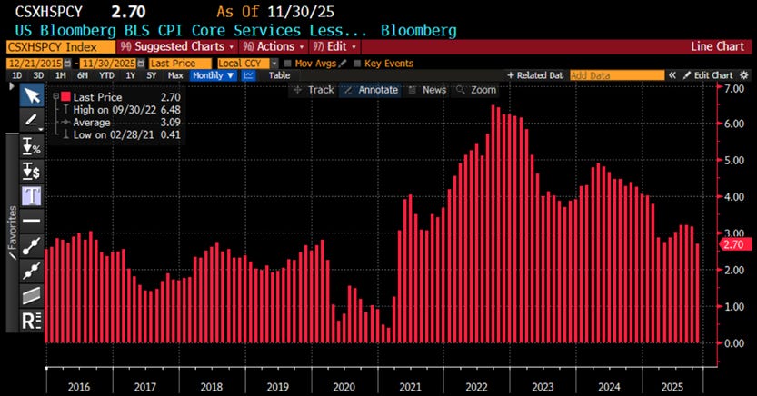 Adding to the ever-optimistic narrative that inflation is “behind us,” the SuperCore CPI—core services ex-housing, the Fed’s favorite vanity mirror—cooled to +2.7% YoY in November, its lowest since April, politely interrupting a five-month reacceleration streak. Translation: no victory parade, just a brief smoke break. But yes, inflation is totally dead… as long as you squint hard, ignore rent, goods, food, and reality, and top up your daily dose of ‘hopium’.
