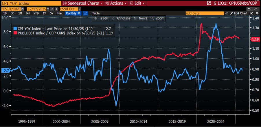 US CPI YoY Change (blue line); US Debt to GDP ratio (red line).