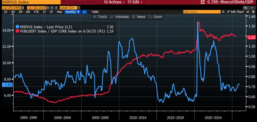 US Misery Index (blue line); US Debt to GDP ratio (red line).