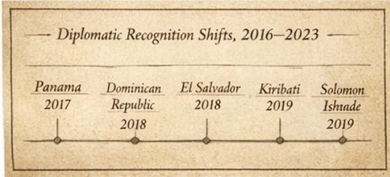 Latin America increasingly shows signs of being the next theater where this playbook is applied. Since 2016, nine countries have severed diplomatic ties with Taiwan and recognized Beijing, often following periods of fiscal stress, infrastructure need, or political transition. These recognition decisions affect UN seating, agency participation, and the perceived legitimacy of Taiwan’s international standing.