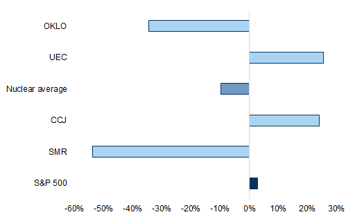 Exhibit 12: Our nuclear coverage has underperformed the S&P 500 by 13% over the last quarter