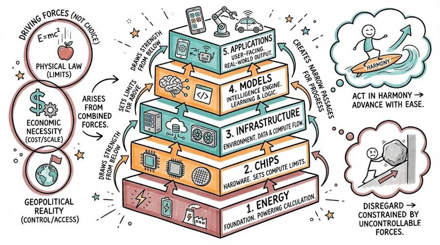 All enduring systems are built according to order and balance. The structure of AI rests upon five interdependent layers: Energy, Chips, Infrastructure, Models, and Applications. Each layer draws its strength from the one beneath it, sets the limits of the one above, and creates the narrow passages through which progress must move. This order is not a matter of choice or imagination. It arises from physical law, economic necessity, and geopolitical reality combined. Those who act in harmony with this structure advance with ease; those who disregard it find themselves constrained by forces they do not control.