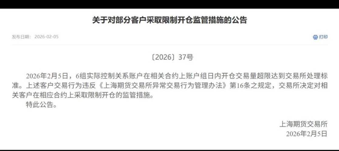 In Notice [2026] No. 37, the exchange said the account groups breached intraday opening transaction thresholds in related contracts, violating Article 16 of the Shanghai Futures Exchange Measures for the Administration of Abnormal Trading Behavior. The exchange imposed regulatory measures restricting the opening of new positions in the affected contracts.