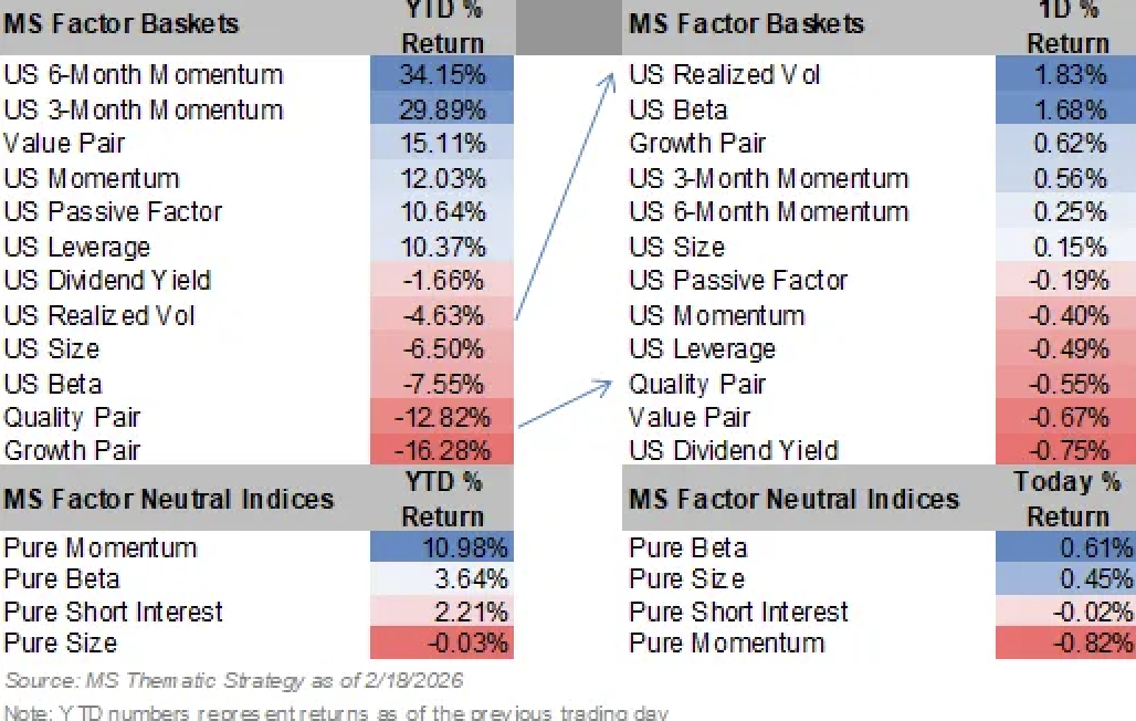 One of the most interesting parts was a sharp early rally in stocks that had been left behind (the “out of favor” or high-short-interest pocket). The High Short Interest basket (MSXXSHRT) spiked +2.6% from 9:30 to 10:00 a.m. and held most of those gains, closing +1.7%. Single-name examples included APP +7%, INTU +2.7%, IQV +4%, and DASH +6.8% — some of the strongest performers in the entire S&P 500. The Realized Volatility pair (MSZZRVOL) also tried to stabilize, up +1.8% after a brutal -20% correction from recent highs.