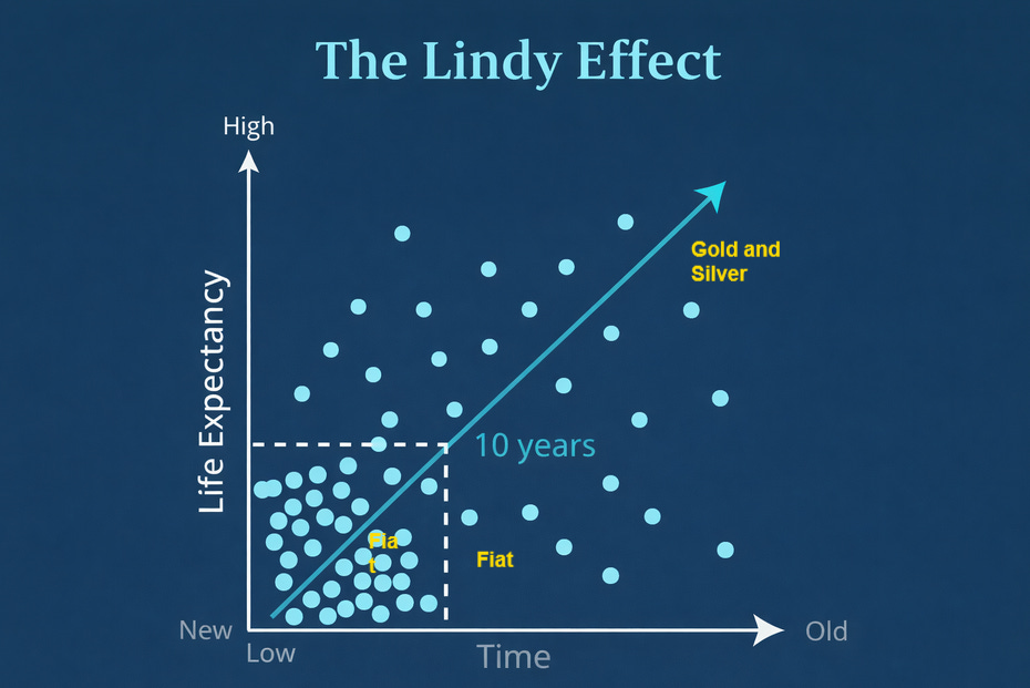 Under Lindy’s Law, this longevity carries probabilistic weight. If gold has served as a store of value for millennia, then its expected remaining lifespan extends accordingly. If it has lived for 5,000 years, one may reasonably assume that it could live for another 5,000. That is not a guarantee of performance. It is an inference about survivability.