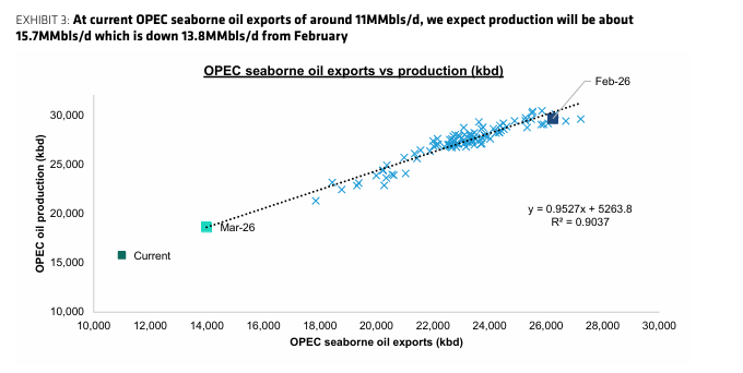 This represents a system-level interruption at one of the most concentrated energy arteries globally. Page 3 reinforces this through real-time export tracking, showing OPEC seaborne flows collapsing from roughly 25MMb/d to around 11MMb/d.