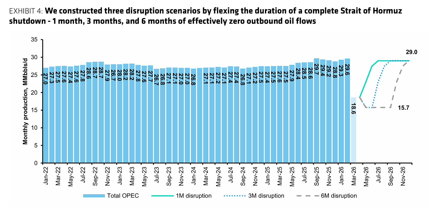 The report centers on a single controlling variable: time. Oil is already repricing higher, but the terminal level depends entirely on how long the Strait of Hormuz remains impaired.