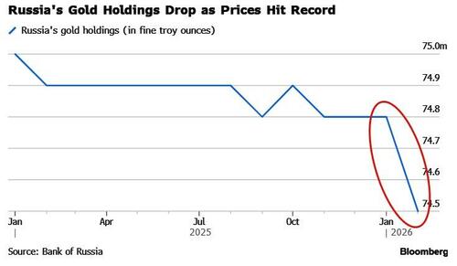 As Bloomberg reports, The Bank of Russia began drawing on its bullion last year as part of so-called mirror operations linked to the Finance Ministry’s sales of National Wellbeing Fund assets.