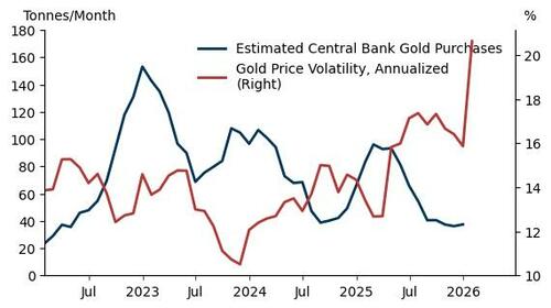 This rise in volatility, in turn, has led to a slowdown in Goldman Sachs' central bank demand nowcast, which they see as temporary.