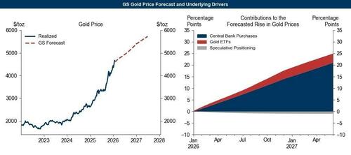 However, amid the very recent turmoil, Thomas remains bullish, forecasting gold at $5,400 per ounce by end-2026 (with significant upside risk from further private diversification flows not yet fully priced in).