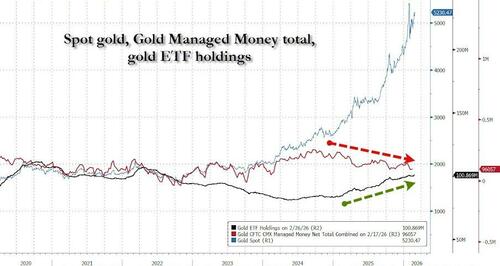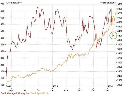 Specifically, top Goldman Sachs futures trader, Robert Quinn, notes that Gold Managed Money net purchased +$1.4bn from February 10th - 17th, ending a 3 week streak of selling which totaled -$22.9bn.